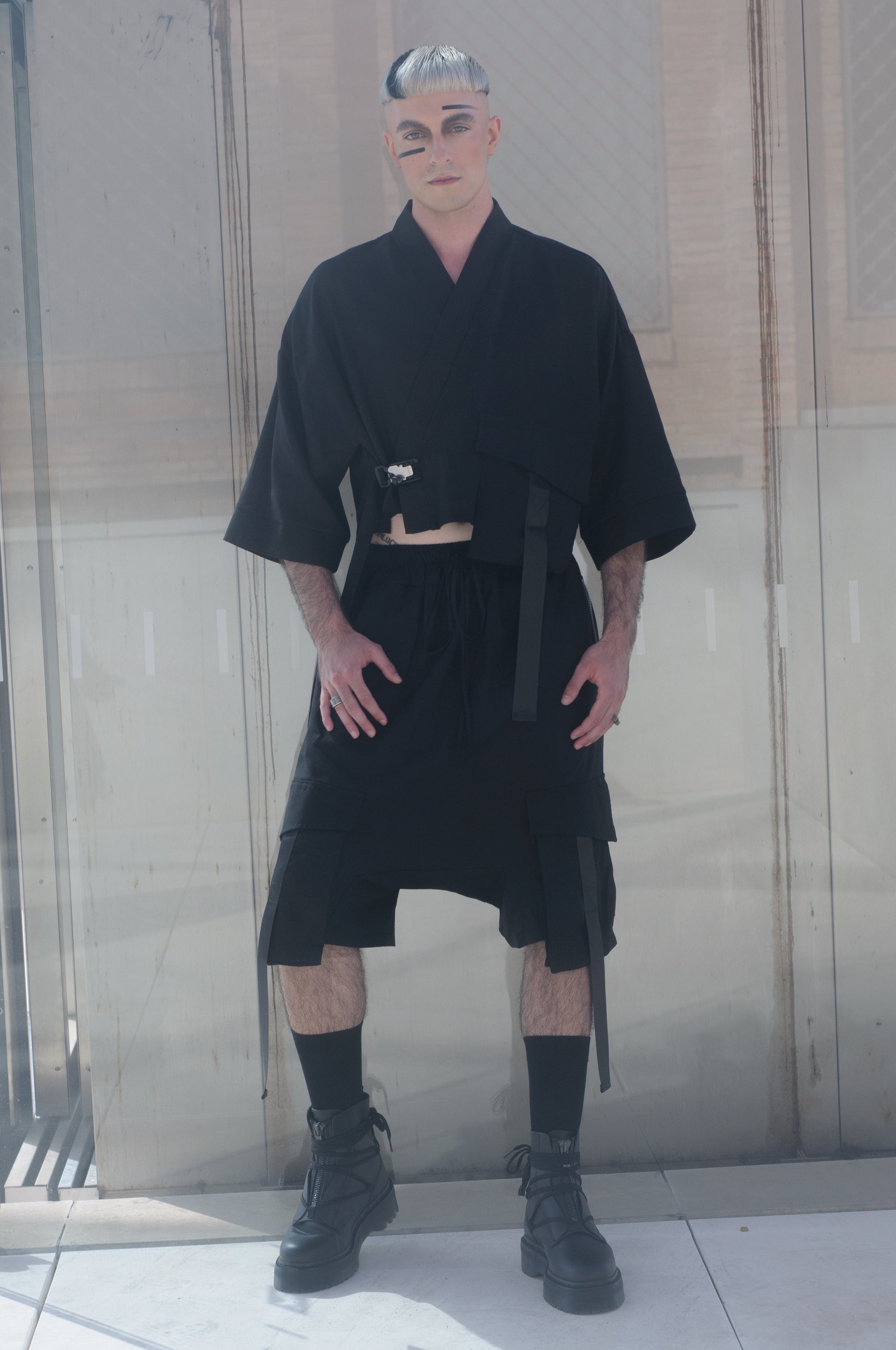 Pantalón corto avant-garde de estética techwear y detalles funcionales, diseñado como prenda versátil y unisex.